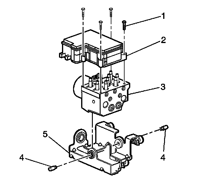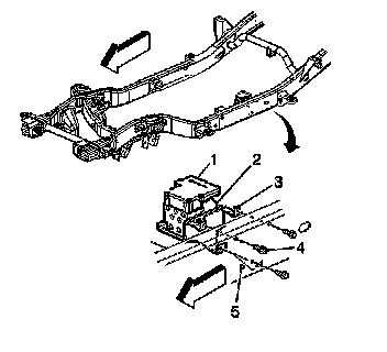 5. Remove the bolts (4) securing the EHCU mounting bracket (3) to the frame rail (5).
