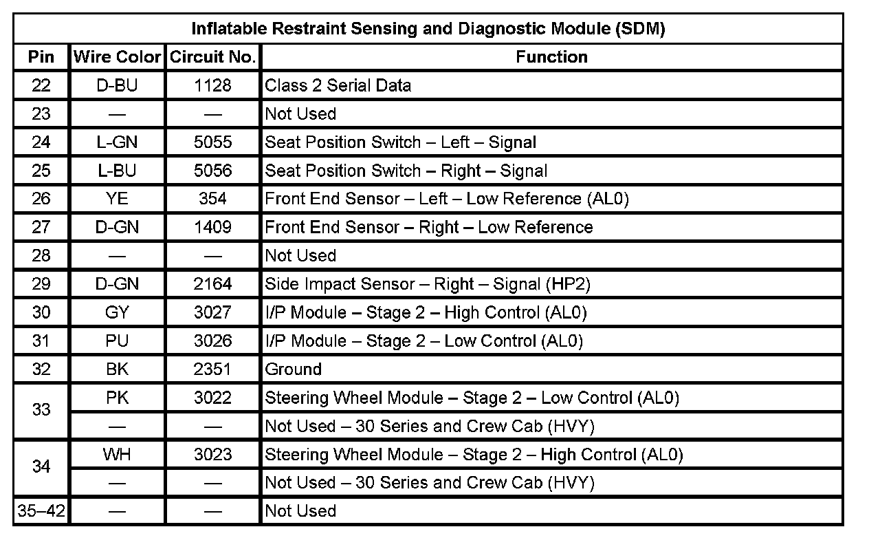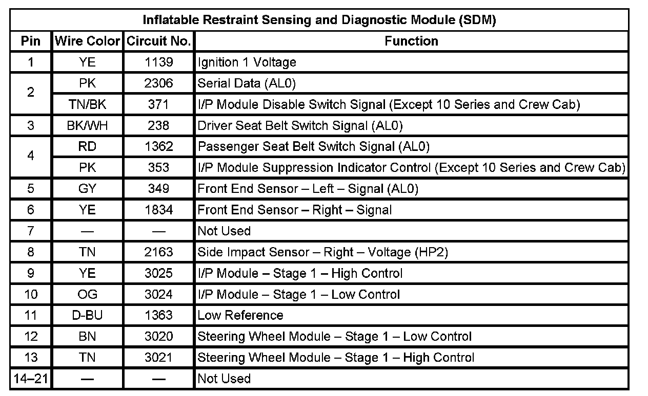 Inflatable Restraint Sensing And Diagnostic Module (SDM) (Pin 1 To 21):