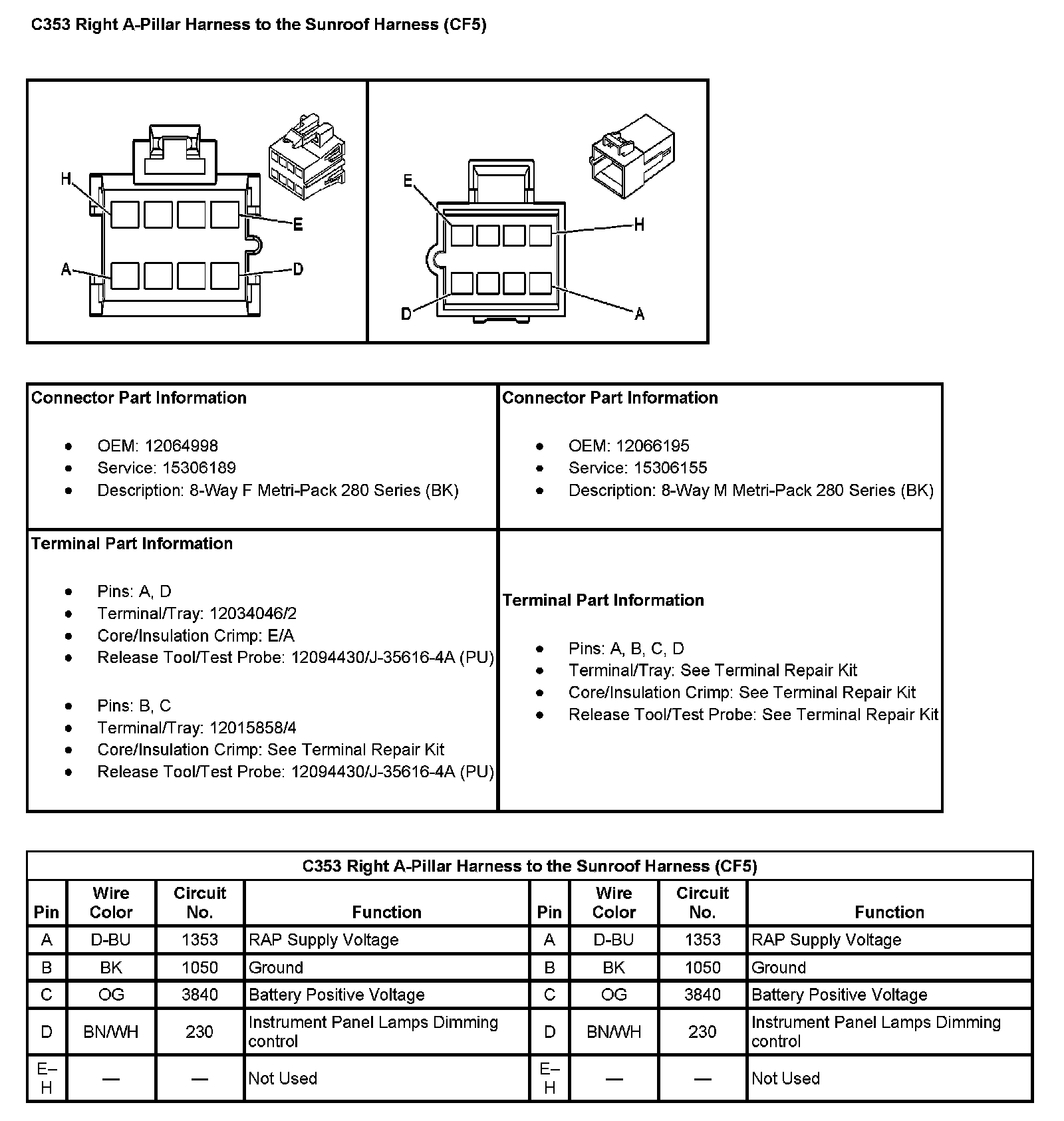 C353 Right A-Pillar Harness To The Sunroof Harness (With RPO Code CF5):