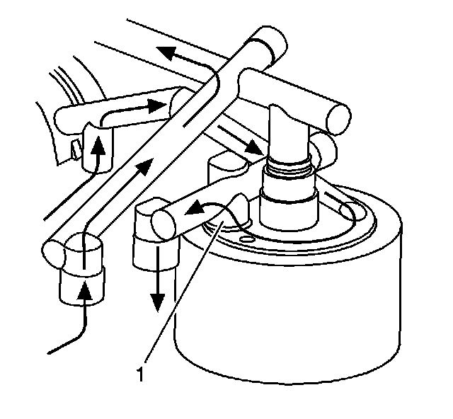 If the oil cooler flow becomes blocked, either from a plugged oil cooler or blocked or kinked oil cooler line, the oil cooler bypass valve (1) is forced open, allowing oil to flow directly into the engine oil passages. Oil does not flow into or out of the engine oil cooler.