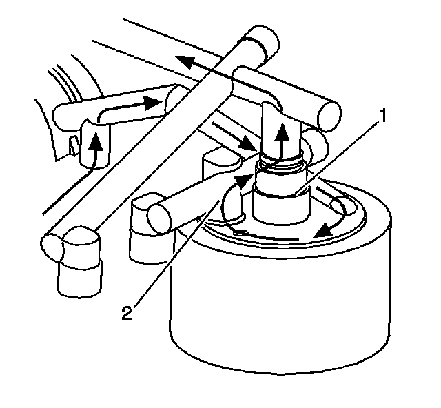 If the oil filter becomes plugged, the pressurized oil is diverted around the top of the oil filter. The oil filter bypass valve (1) is forced open, allowing the oil to continue on to the oil cooler and engine oil passages. No oil filtration occurs because the oil is not allowed into the oil filter.