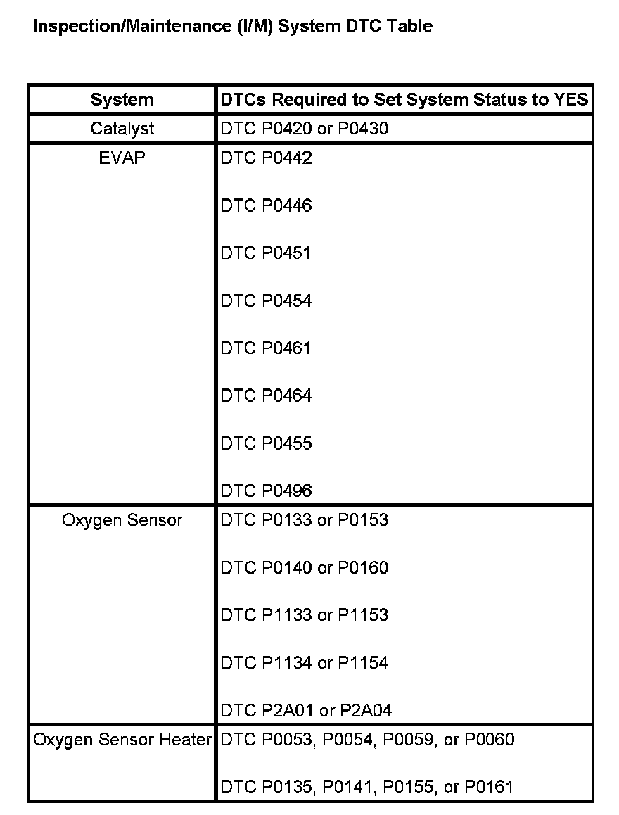 Inspection/Maintenance (I/M) System DTC Table: