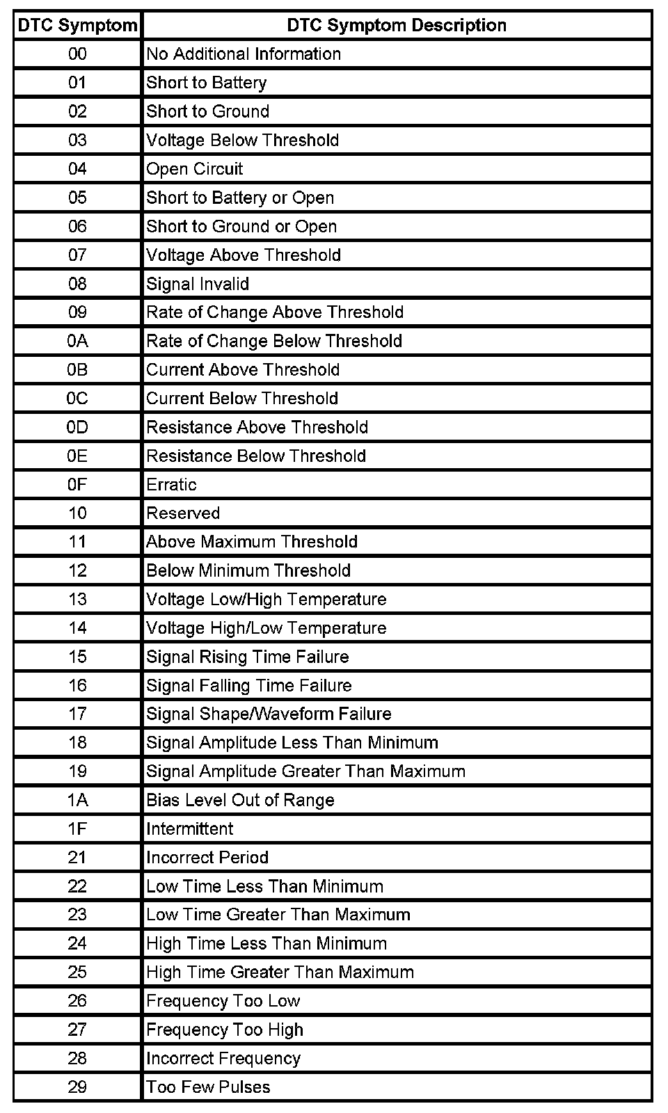 A DTC symptom is a 2-digit number which adds additional detail to a DTC. The DTC symptom provides additional information without requiring a large increase in the number of new DTCs.