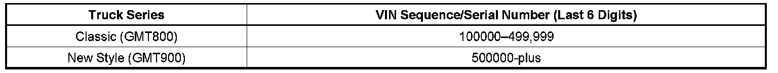 During the 2007 Model Year both the "Classic" (GMT800) and New Style (GMT900) series pickup trucks were produced concurrently. The 2007 VIN reference card does not provide any identifier to indicate which series of vehicle is present through the VIN number. This has been reported as an inconvenience and source of possible confusion during write-up and repair.