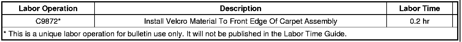 3. Install two 100 mm (3.90 in) long strips of Velcro hook material, GM P/N 12520271 to the corresponding area of the carpet assembly.