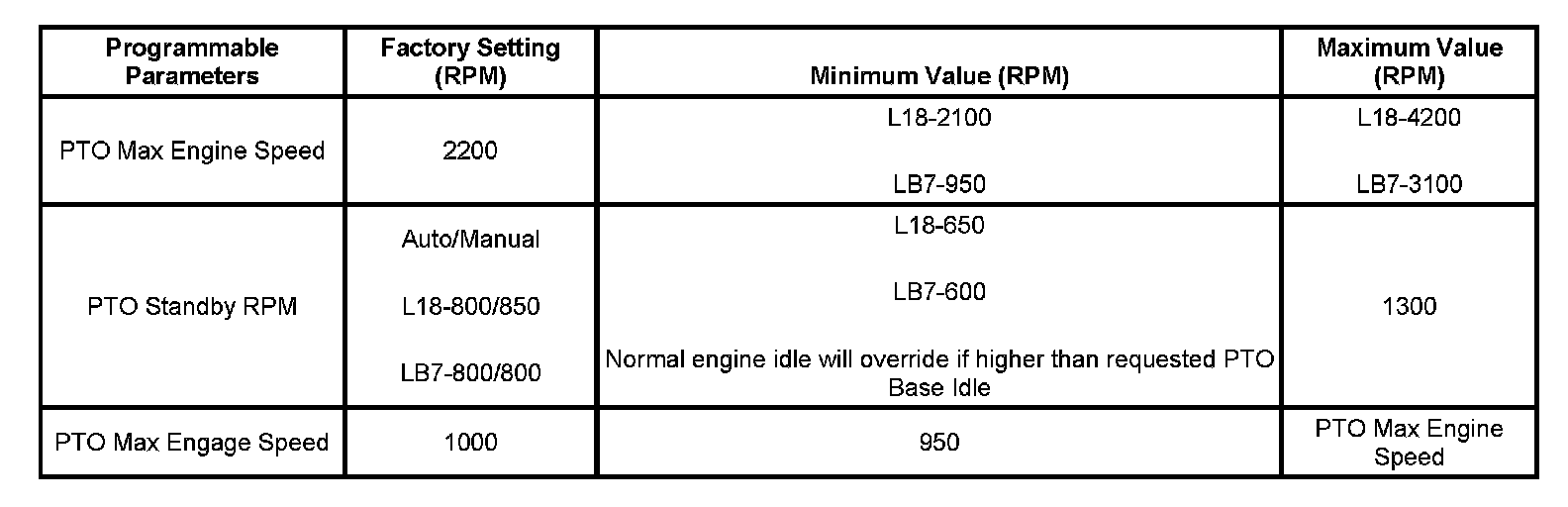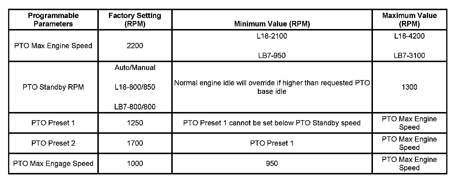 The PTO preset mode is used for stationary applications. PTO will remain engaged while mobile in the preset mode however PTO Preset 1 and PTO Preset 2 speed controls will be inoperative. The engine RPM will also return to normal. This mode provides a default standby speed of 800 or 850 RPM depending on the engine and transmission combination. This mode also provides 2 default PTO control speeds: PTO Preset 1 of 1250 RPM and PTO Preset 2 of 1700 RPM. Please note that the standby speed is not to be used as a PTO control speed. Vehicles not equipped with cruise control will not have the resume speed capability.