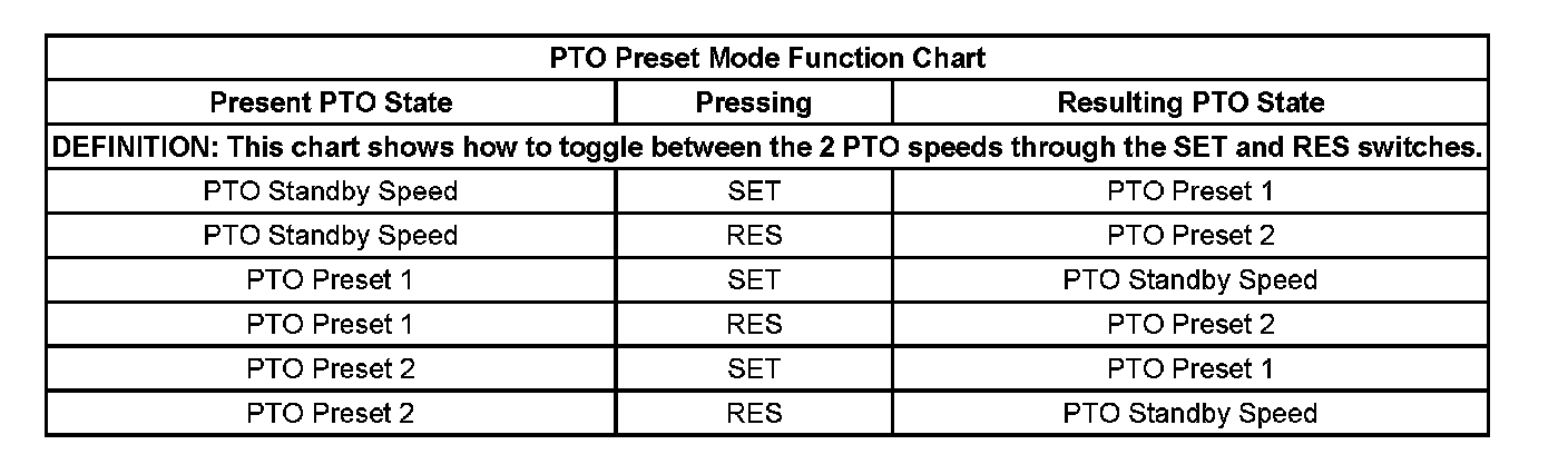 PTO Preset Mode Function Chart: