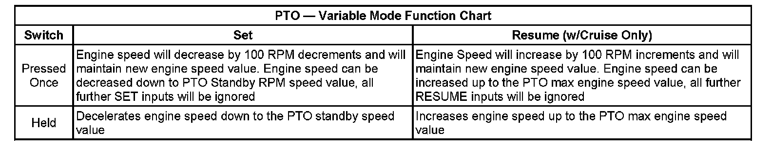 The operation of the PTO system may be through the function control switches located on the multifunction turn signal lever. The cruise control function control switches includes the ON/OFF, SET/COAST, and R/A. The switch assembly provides driver control of the PTO as well as the cruise control system. The SET/COAST and R/A switches may be used to increase and decrease engine RPM in increments of 100 RPM. See the chart below for recommended speeds.