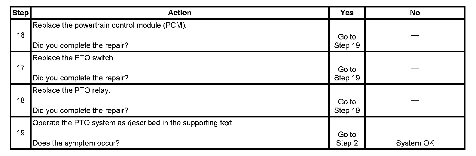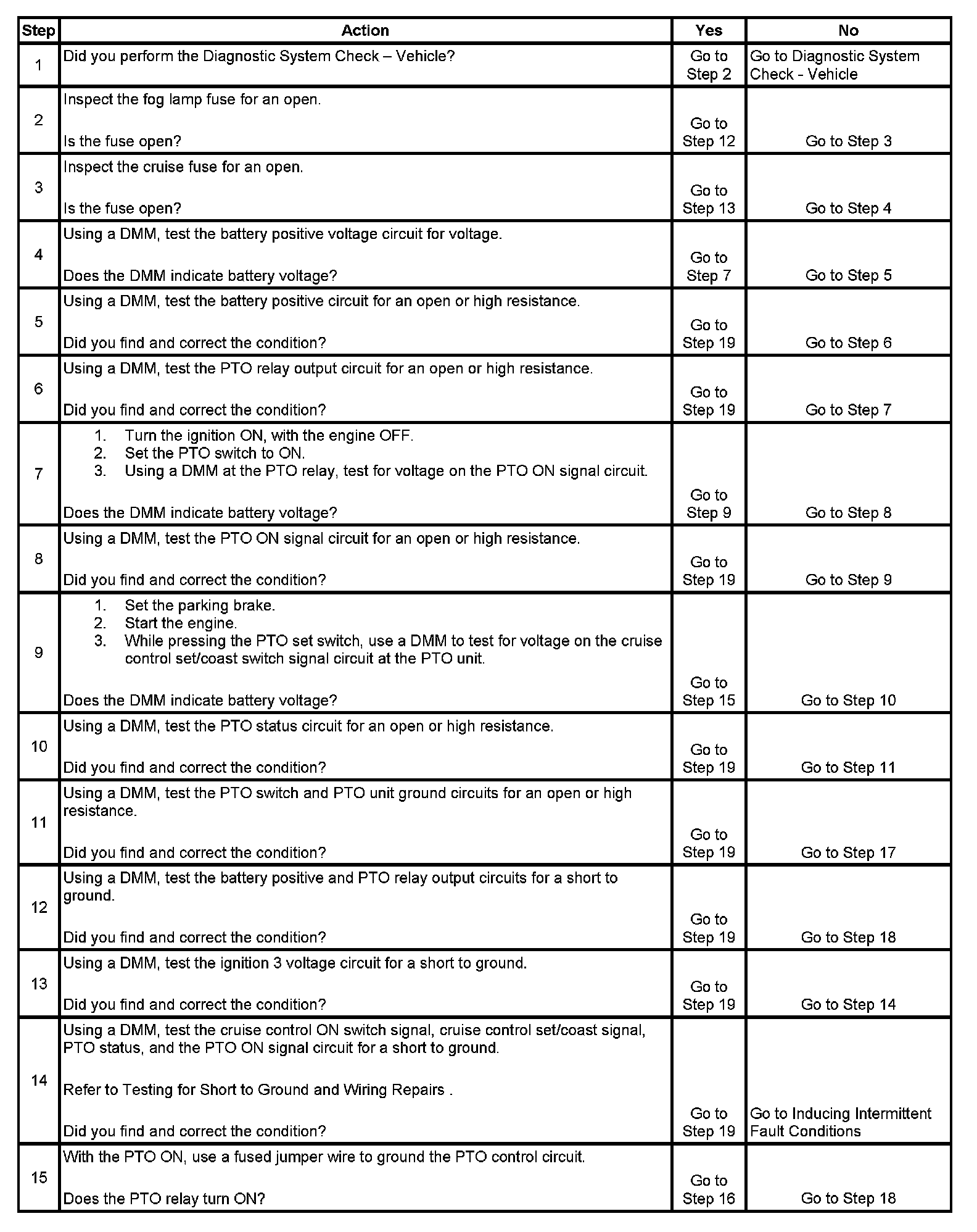 15. This step tests the control side of the PTO relay for proper operation.