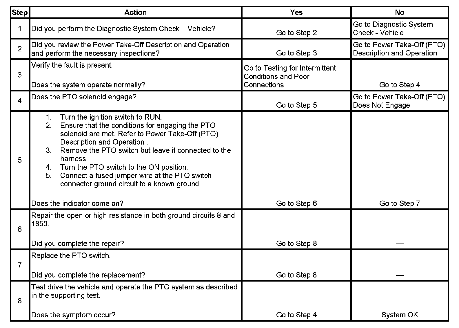 This symptom chart will aid in diagnosing a failed power take-off (PTO) indicator. This diagnostic assumes that the PTO solenoid is functional and only the indicator is failing to come on. When the ignition switch is in RUN, voltage should be present on the Ignition 3 Voltage circuit. When the PTO switch is turned to ON, the LED will illuminate. The indicator has its own ground circuit. The LED and PTO solenoid have different ground circuits. Therefore, the LED may be illuminated when the PTO solenoid is disengaged.