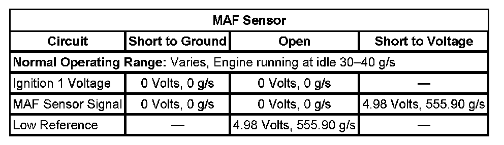 The mass air flow (MAF) sensor is an air flow meter that measures the amount of air entering the engine. The engine control module (ECM) uses the MAF sensor voltage signal to provide the correct fuel delivery for a reduction in emissions. The ECM uses the MAF sensor signal to control fuel delivery until a calibrated amount of engine air flow is attained. The MAF sensor produces an output voltage based on the inlet air flow through the air induction system. This output voltage will display on the scan tool as a voltage parameter and as a grams per second (g/s) parameter. The ECM compares the actual MAF sensor voltage signal to a predicted MAF value. This comparison will determine if the signal is stuck, or is too low or too high for a given operating condition.