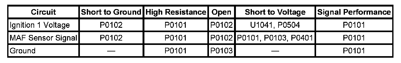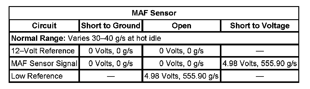 The MAF sensor produces an output voltage based on the inlet air flow through the air induction system. This output voltage will display on the scan tool as a voltage parameter and as a grams per second (g/s) parameter. If the ECM detects that the actual MAF sensor voltage signal is greater than or less than the possible range of a normally operating sensor it will set a DTC.