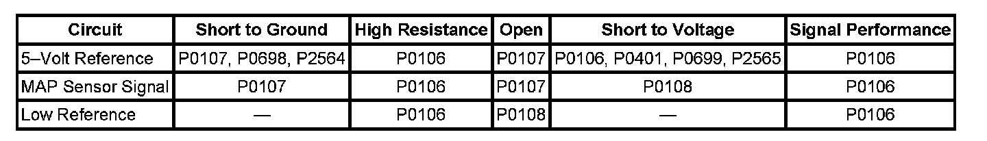 The manifold absolute pressure (MAP) sensor measures the pressure inside the intake manifold. Pressure in the intake manifold is affected by turbocharger output, engine speed, accelerator pedal input, air temperature, and barometric pressure (BARO). A diaphragm within the MAP sensor is displaced by the pressure changes that occur from the varying load and operating conditions of the engine. The engine control module (ECM) supplies a regulated 5 volts to the sensor on the 5-Volt reference circuit. The ECM supplies a ground on the low reference circuit. The MAP sensor provides a signal voltage to the ECM, relative to the pressure changes, on the MAP sensor signal circuit. The ECM converts the signal voltage input to a pressure value. Under normal operation, the lowest pressure that can exist in the intake manifold is equal to the BARO. This occurs when the vehicle is operating at idle or when the ignition is ON, while the engine is OFF. The ECM uses the MAP sensor to aid in diagnosis of the turbocharger performance. The highest manifold pressures occur when the turbocharger output is high. Manifold pressure can range from 58 kPa (8 psi) when pressure are low, to more than 240 kPa (34 psi) when pressures are high, depending on the BARO. The MAP sensor has a range of 33-255 kPa (4-36 psi).