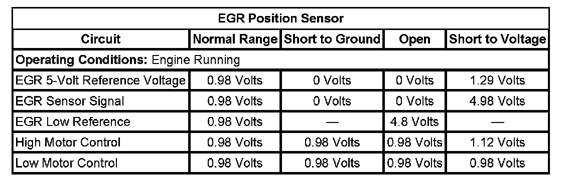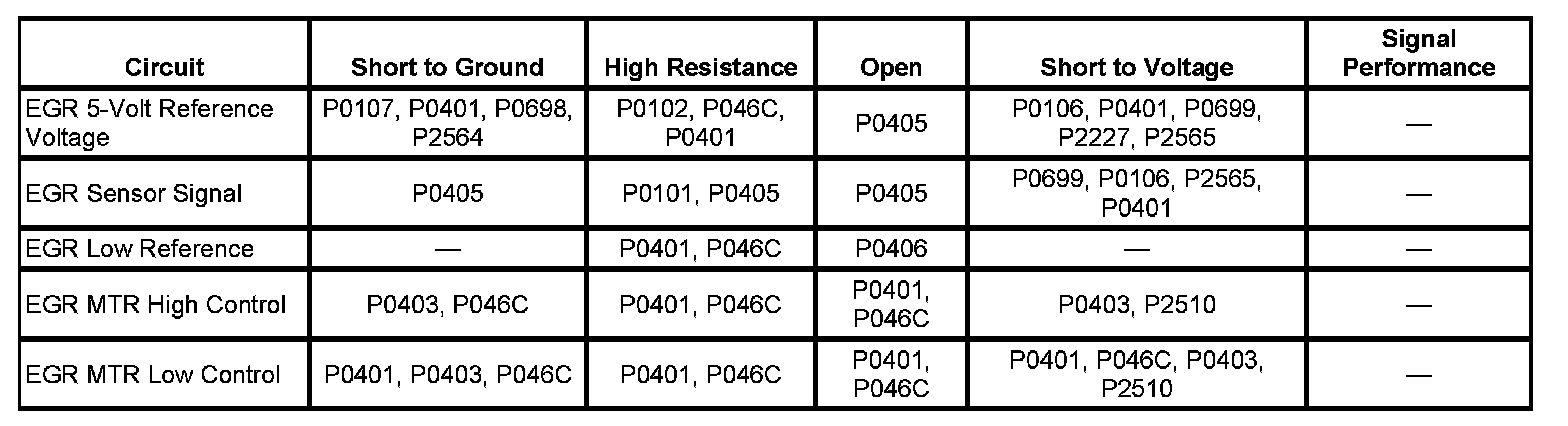The exhaust gas recirculation (EGR) valve is controlled by the engine control module (ECM) through the EGR motor high control and the EGR motor low control circuits. The ECM supplies voltage that is near ignition voltage to the high and low control circuits at all times. The ECM will pulse width modulation (PWM) the low control circuit to ground when EGR is desired. The lower the pulse width, the more the valve will open. The ECM will PWM the high control circuit to ground when the EGR valve is desired closed. If the ECM detects an electrical malfunction on the control circuits, DTC P0403 will set.