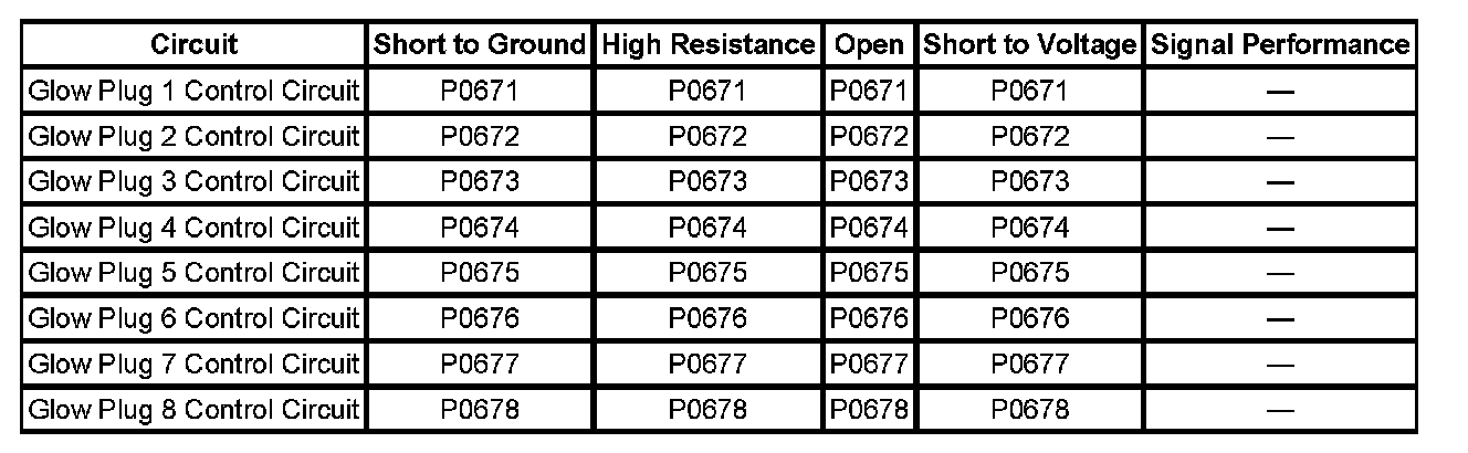 The glow plug controller has the ability to perform internal checks, an open or a short to ground on each of the glow plug circuits. If the glow plug controller senses a problem in a glow plug circuit, the glow plug on the affected cylinder will be disabled and the glow plug controller will send an error message to the engine control module (ECM). If this condition exists, the DTC will set.