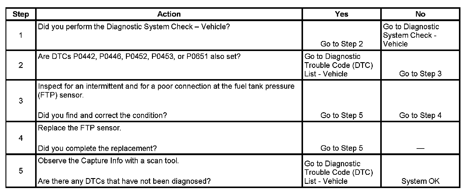 The fuel tank pressure (FTP) sensor measures air pressure or vacuum in the Evaporative Emission (EVAP) System. The control module supplies a 5-Volt reference and a low reference circuit to the FTP sensor. The FTP sensor signal voltage varies depending on EVAP System pressure or vacuum. The controller uses this FTP signal to determine atmospheric pressure for use in the engine OFF small leak test, P0442. This DTC will set if the control module detects an intermittent signal from the FTP that would prevent the engine-off small leak test, P0442, from running.