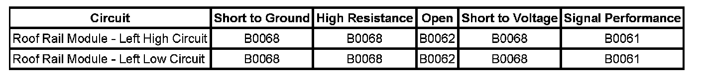 * Roof rail module - left high circuit is less than 2.4 volts and the roof rail module - left deployment loop is more than 6 ohms for 500 milliseconds.