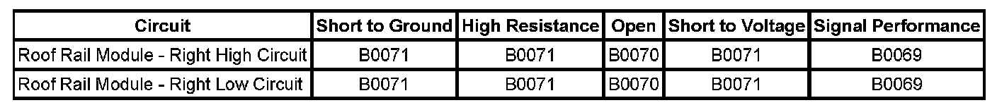 * Roof rail module - right high or low circuits is short to ground or short to voltage for 500 milliseconds.