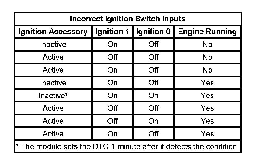 One of the 3 monitored ignition switch circuits has malfunctioned. The DTC will set, if one of the following situations is present: