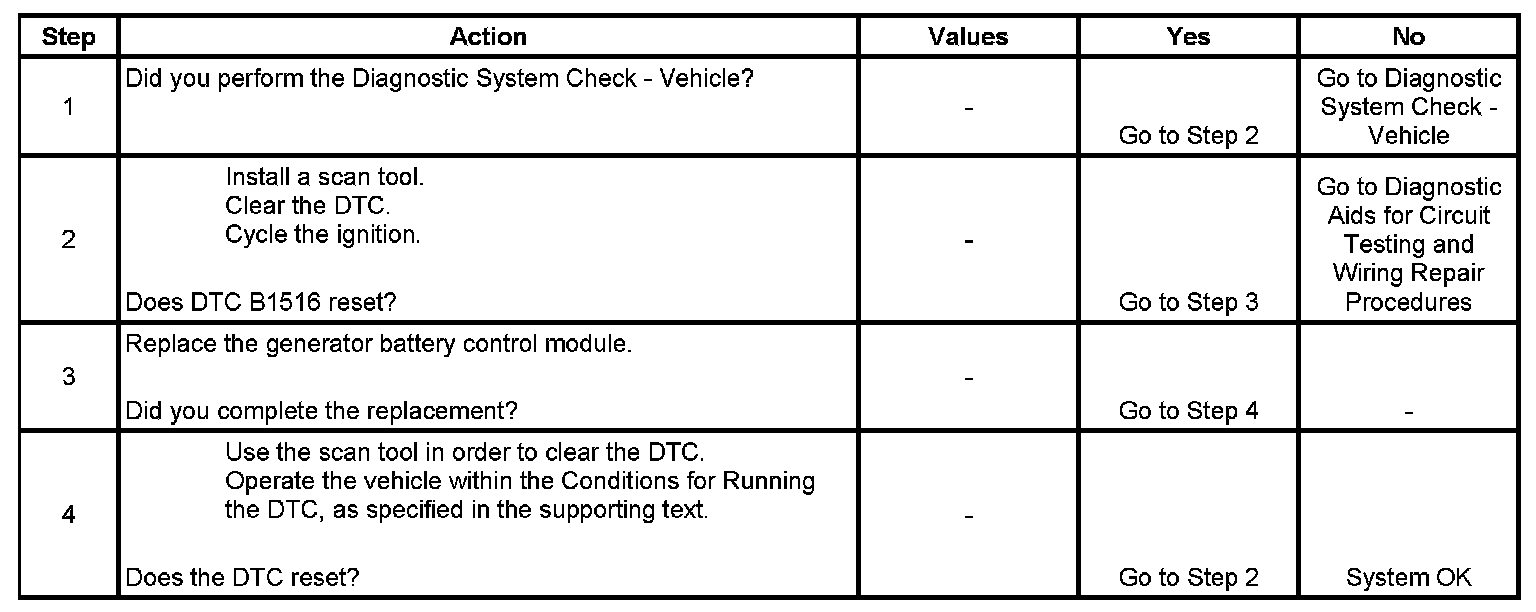 The generator battery control module monitors its internal battery current sensor for many charging system operations. When the values of the battery current sensor go out of range, DTC B1516 will set.