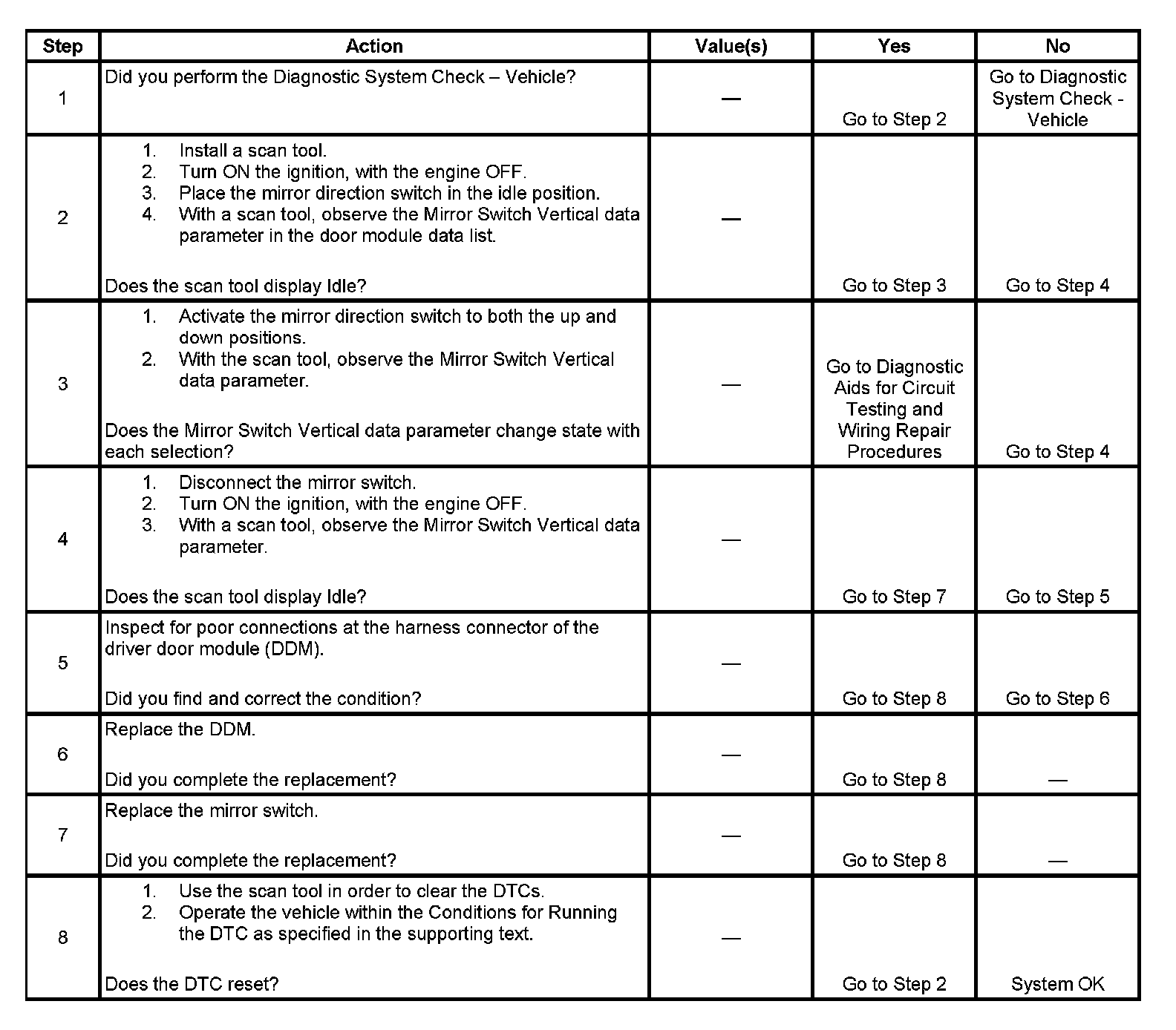 The driver door module (DDM) supplies battery positive voltage to the power mirror switch. When the mirror direction switch is placed in the up or down position, the appropriate signal circuit is switched to battery voltage. The driver door module senses the voltage change and activates the selected outside rearview mirror in the appropriate direction.