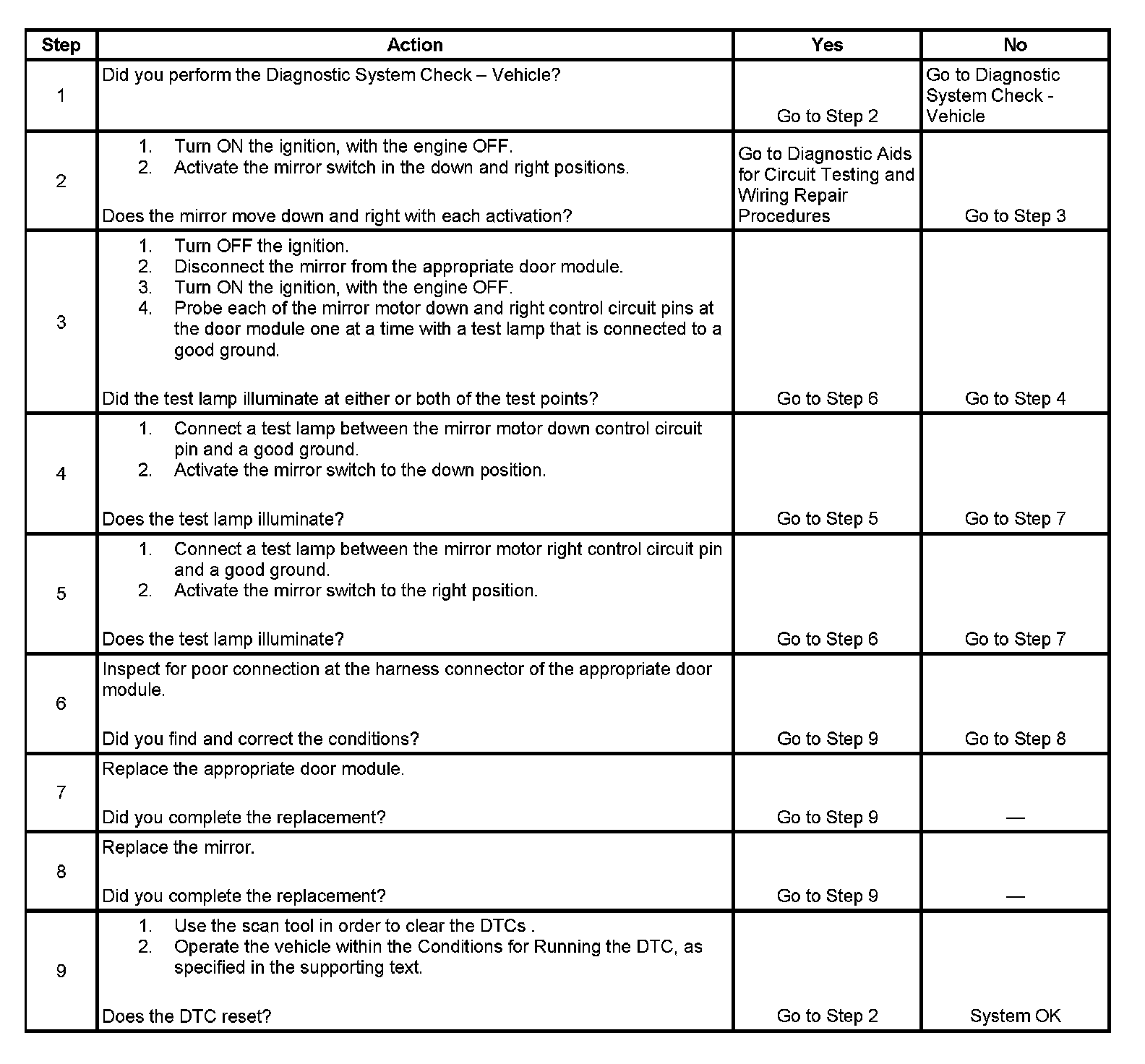 - If the outside rearview mirror motor down control circuit is shorted to ground and the mirror is commanded down