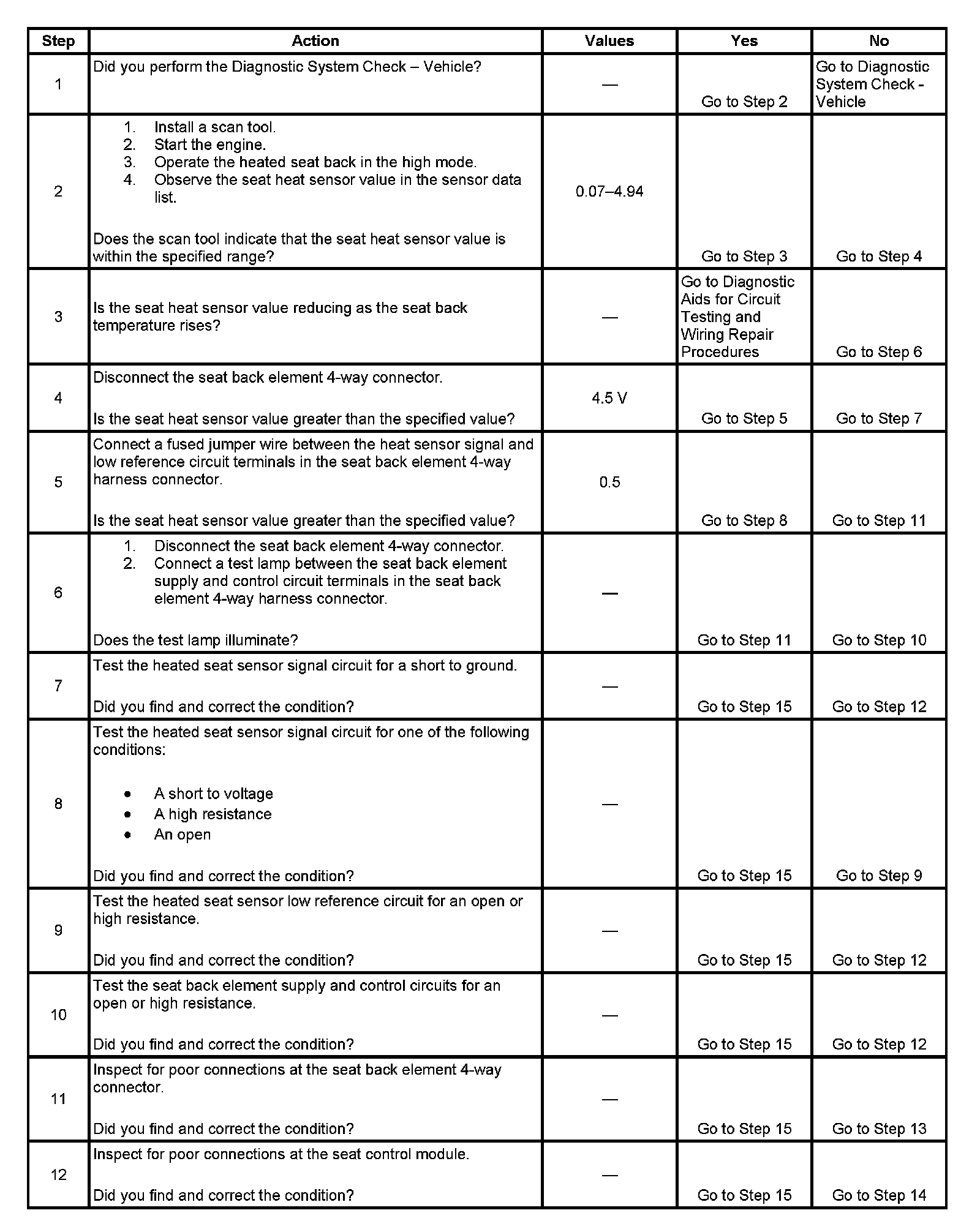 - The heated seat sensor signal circuit voltage to the seat module is less than 0.07 volts for 30 seconds or more.