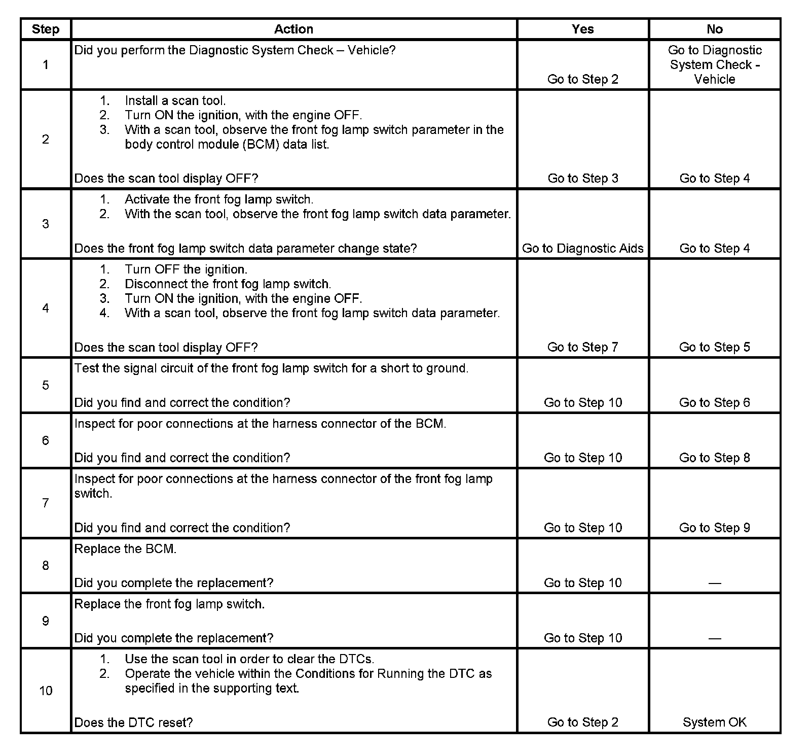 The body control module (BCM) monitors the front fog lamp switch signal circuit in order to determine when the fog lamp relay is to be energized. When the BCM senses that the front fog lamp switch signal circuit is grounded momentarily by pressing the fog lamp switch, the BCM energizes the fog lamp relay by grounding the fog lamp relay control circuit.