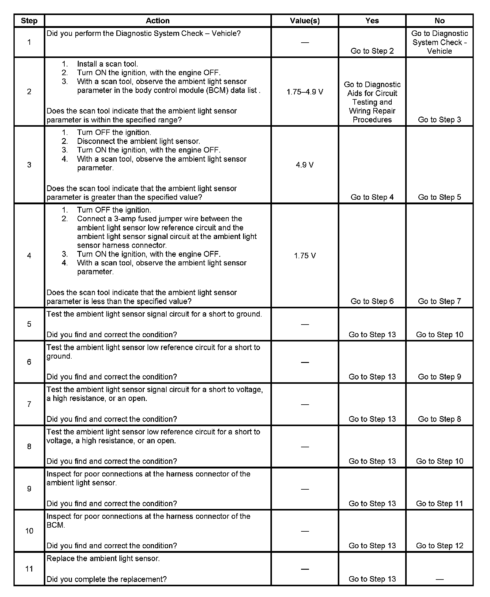 The body control module (BCM) monitors the ambient light sensor signal circuit in order to determine if the daytime running lights (DRL) or the auto headlights (ALC) should be turned ON in the AUTO mode. When the BCM senses the ambient light sensor signal voltage is between 1.75-4.9 volts, either the DRL will be commanded ON or the ALC will be commanded ON depending upon the amount of light received by the sensor.