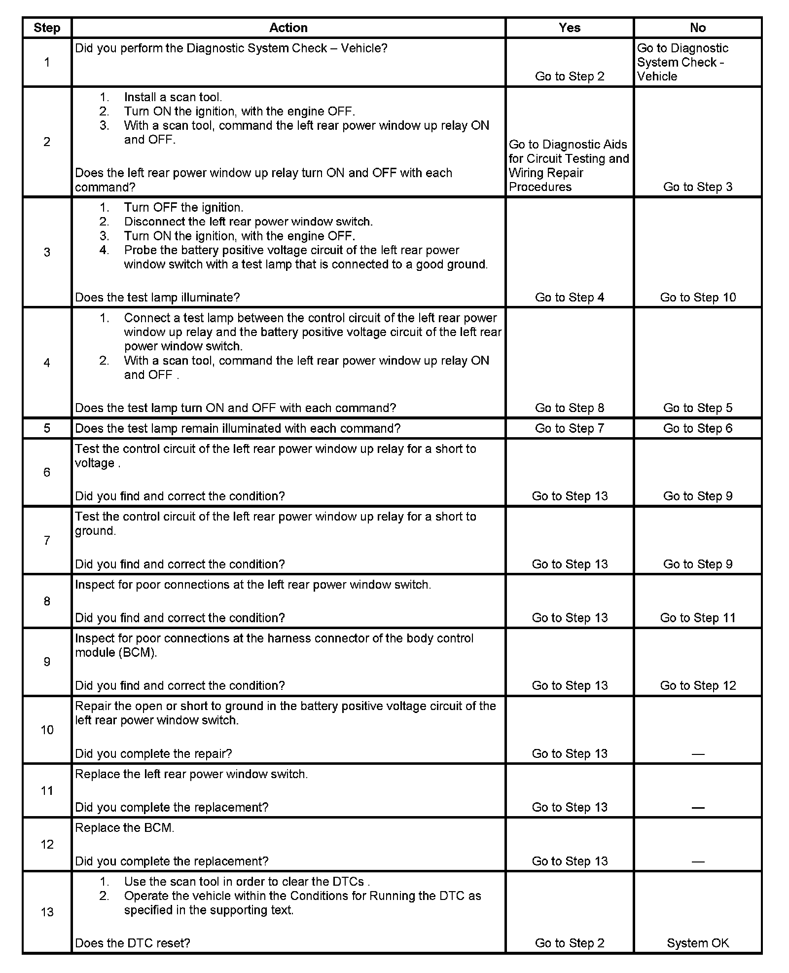 - When the BCM has grounded the left rear power window up relay control circuit and the control circuit is shorted to battery positive voltage.