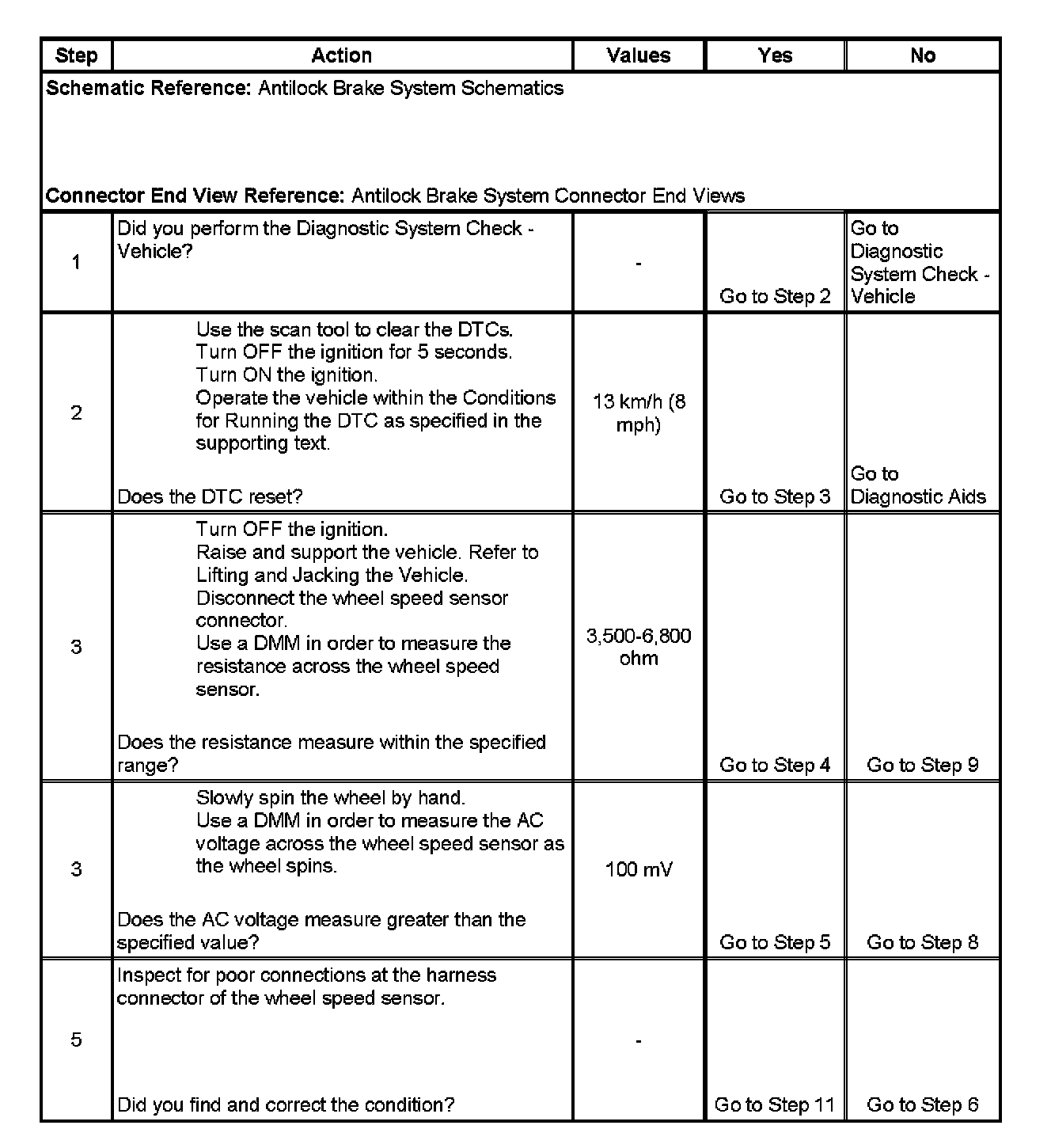 ^ The EBCM detects the absence of a wheel speed sensor signal for 5 seconds. If more than one absent wheel speed sensor signal is detected, the condition must be present for 120 seconds to set DTCs.