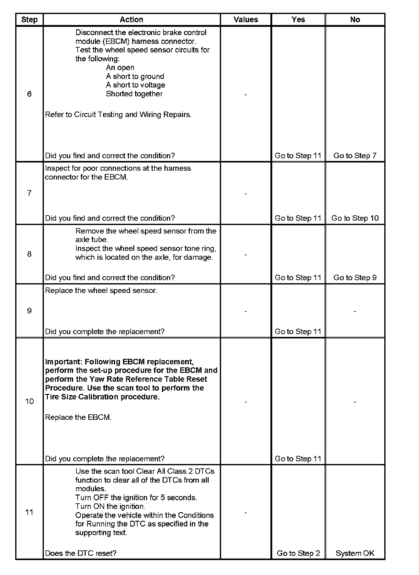 ^ The EBCM disables antilock brake system (ABS)/traction control system (TCS)/vehicle stability enhancement system (VSES) and may disable dynamic rear proportion (DRP) if more than one wheel speed sensor DTC is set.