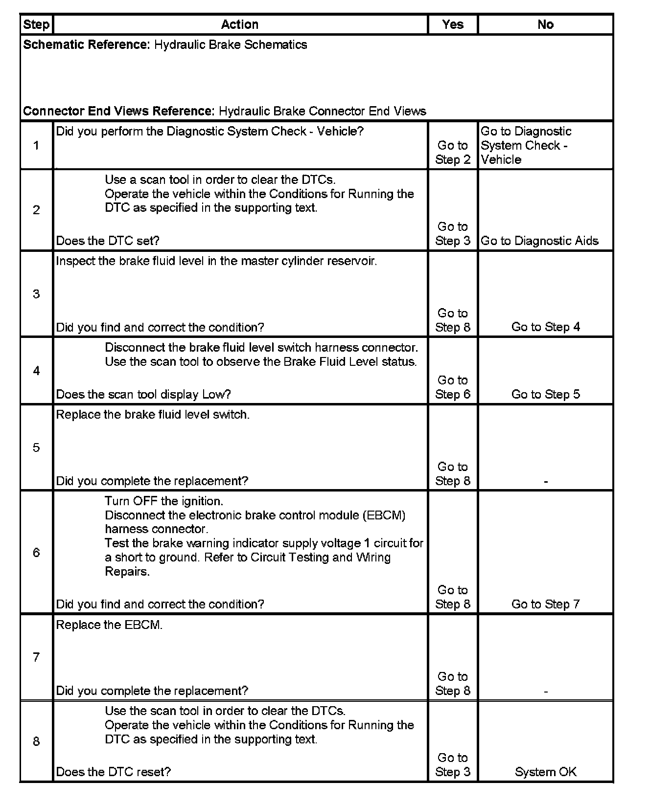 A lower than normal brake fluid level in the master cylinder may cause the brake fluid level switch to close when the vehicle makes sharp turns or sudden stops. Low brake fluid level may be caused by a brake fluid leak or worn disc brake pads. Thoroughly inspect connections or circuitry that may cause an intermittent malfunction. Refer to the following: