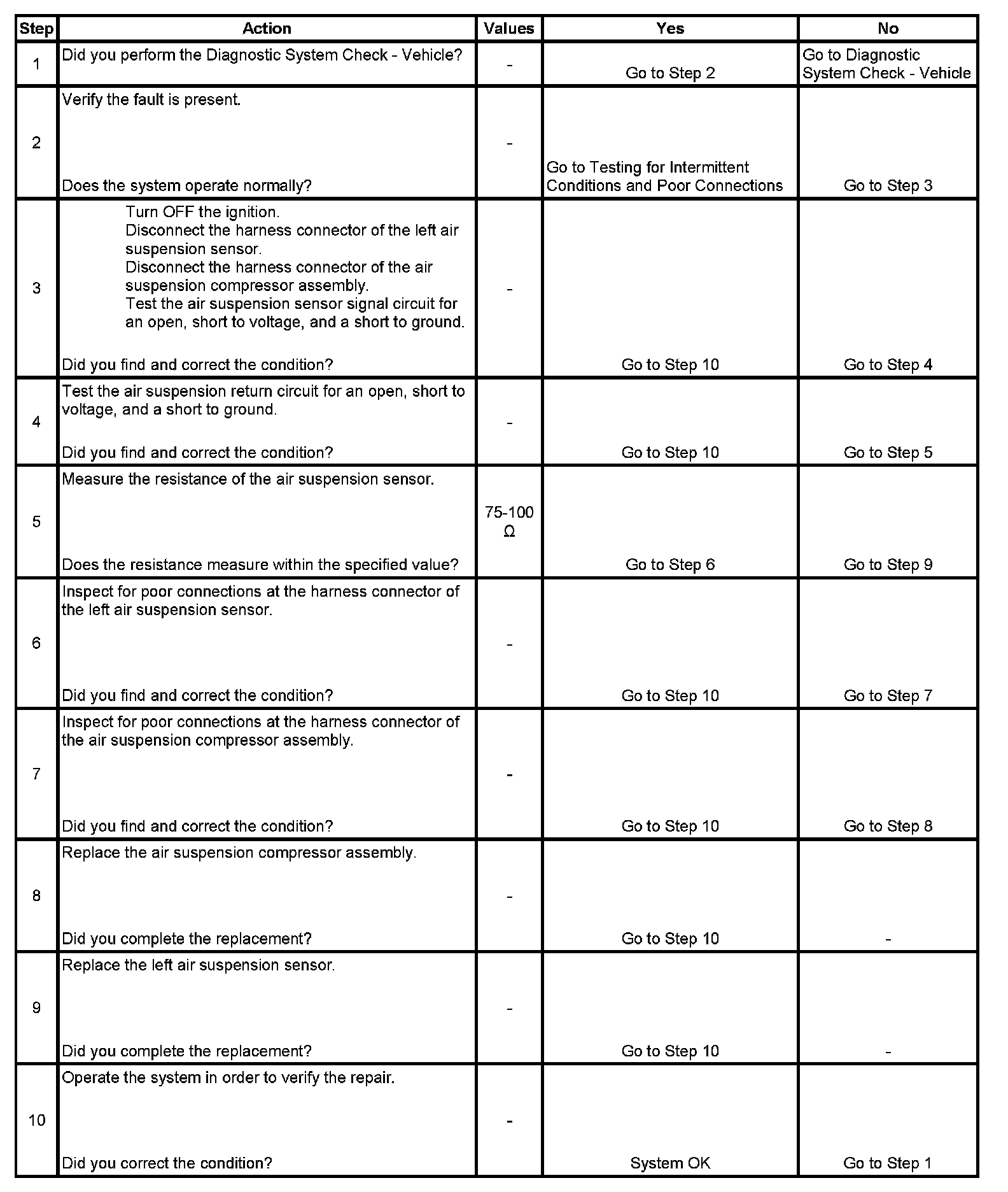 If both air suspension sensor DTCs are set, the air suspension compressor assembly shall deactivate the compressor, corner solenoids, and exhaust solenoids. All leveling functions will be disabled. Inflator functions will not be disabled.