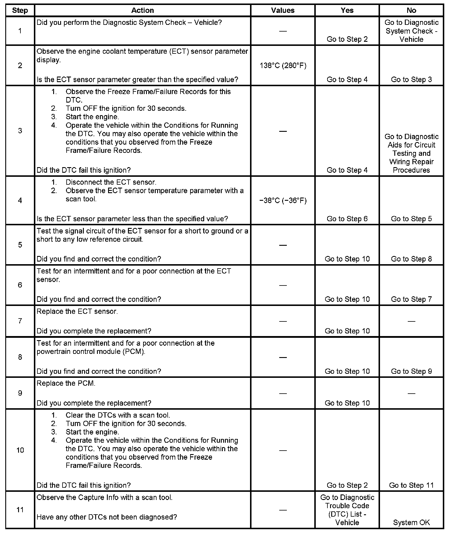 The engine coolant temperature (ECT) sensor is a variable resistor, that measures the temperature of the engine coolant. The powertrain control module (PCM) supplies 5 volts to the ECT signal circuit and a ground for the ECT low reference circuit. When the ECT is cold, the sensor resistance is high. When the ECT increases, the sensor resistance decreases. With high sensor resistance, the PCM detects a high voltage on the ECT signal circuit. With lower sensor resistance, the PCM detects a lower voltage on the ECT signal circuit. If the PCM detects an excessively low ECT signal voltage, which is a high temperature indication, DTC P0117 sets.