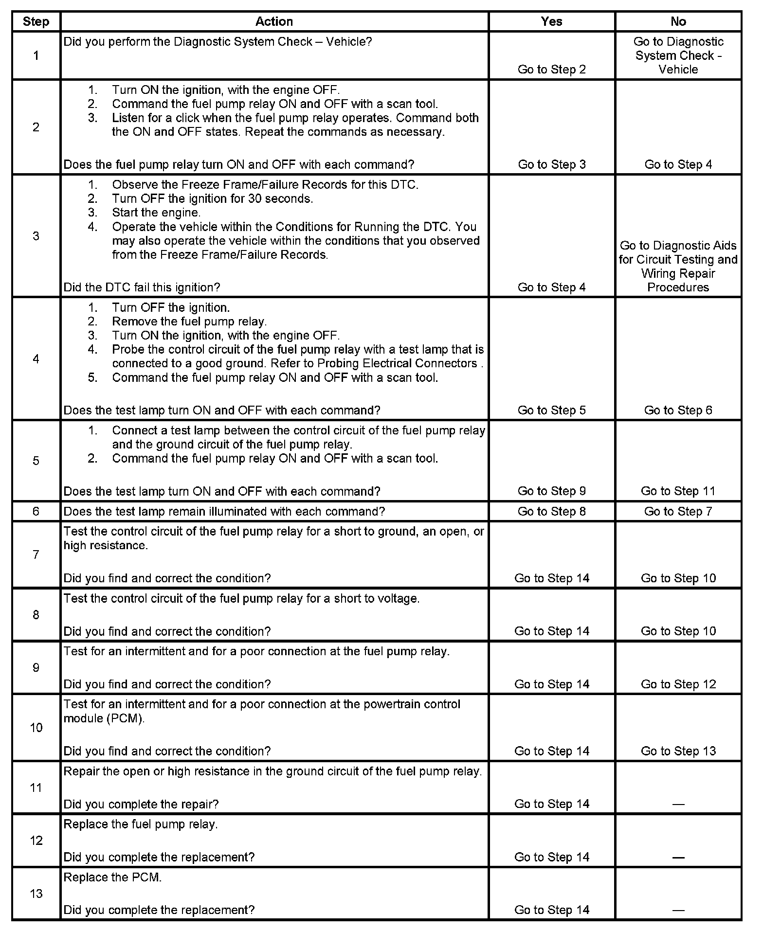 The control module monitors the voltage on the fuel pump relay control circuit. If the control module detects an incorrect voltage on the fuel pump relay control circuit, a fuel pump relay control DTC sets.