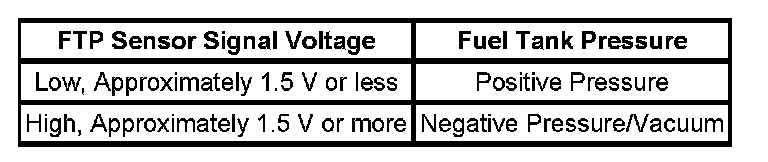 1. Ignition ON and fuel cap removed, verify that the FTP sensor parameter is between 1.3-1.7 volts.