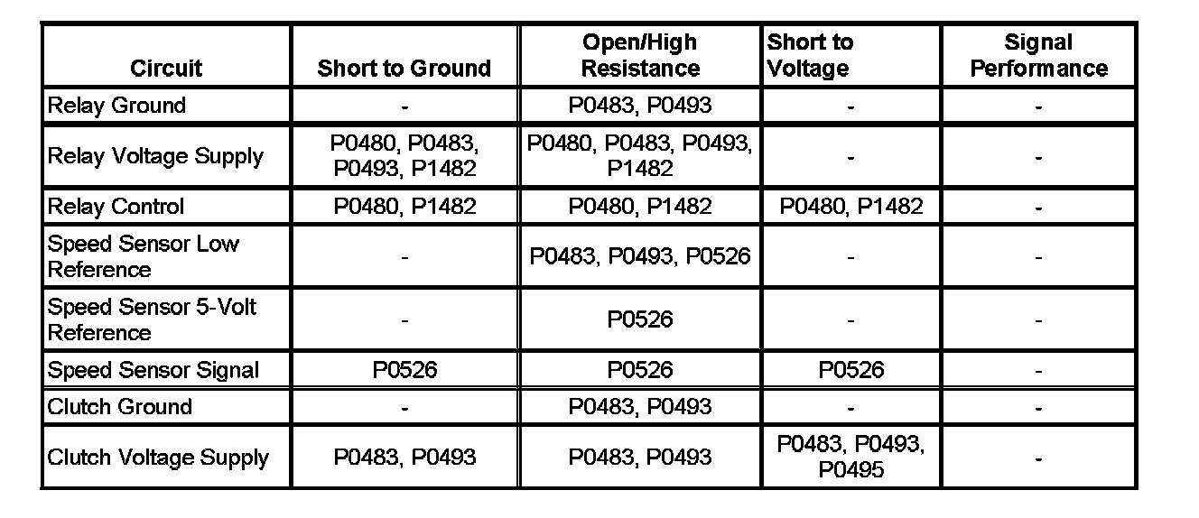 The cooling fan relay sends a pulse width modulation (PWM) signal (12-14 volts) to the cooling fan by the cooling fan clutch supply voltage circuit. The control module uses the PWM signal, which controls the speed of the cooling fan clutch by controlling the position of the oil control valve inside the clutch. If the cooling fan clutch RPM is to high when the control module is commanding 0 percent, DTC P0495 will set.