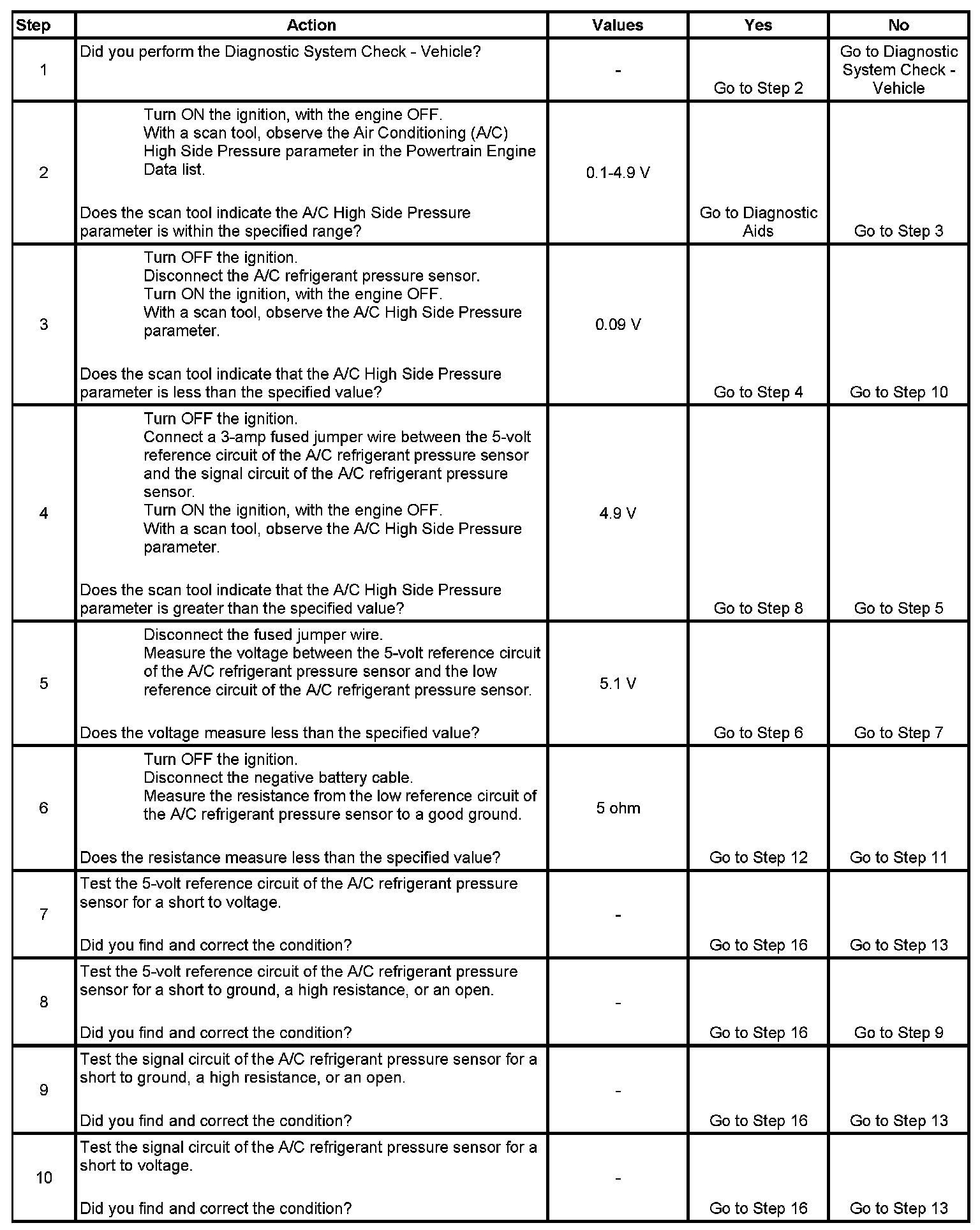 * The A/C refrigerant pressure sensor signal is less than 0.1 volt for 5 seconds.