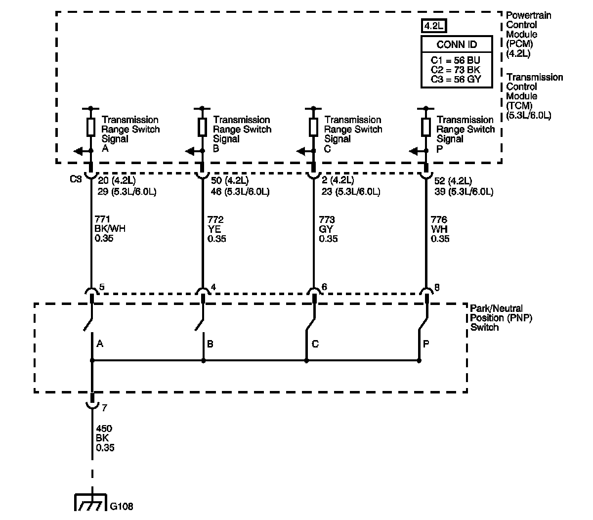 The transmission range (TR) switch is part of the park/neutral position and back-up lamp switch assembly and is externally mounted on the transmission manual shaft. The TR switch is a multi-signal switch. The powertrain control module (PCM)/transmission control module (TCM) supplies ignition voltage to the TR switch on 4 signal circuits, A, B, C, and P. Each gear selector lever position grounds one or more of the switch circuits. In order to determine the gear range selected by the driver, the PCM/TCM compares the voltage combinations on the signal circuits to a look up table stored in the PCM/TCM memory. PCM/TCM detects the selected gear range by the state change of the switch input. Refer to table Transmission Range Switch Logic.