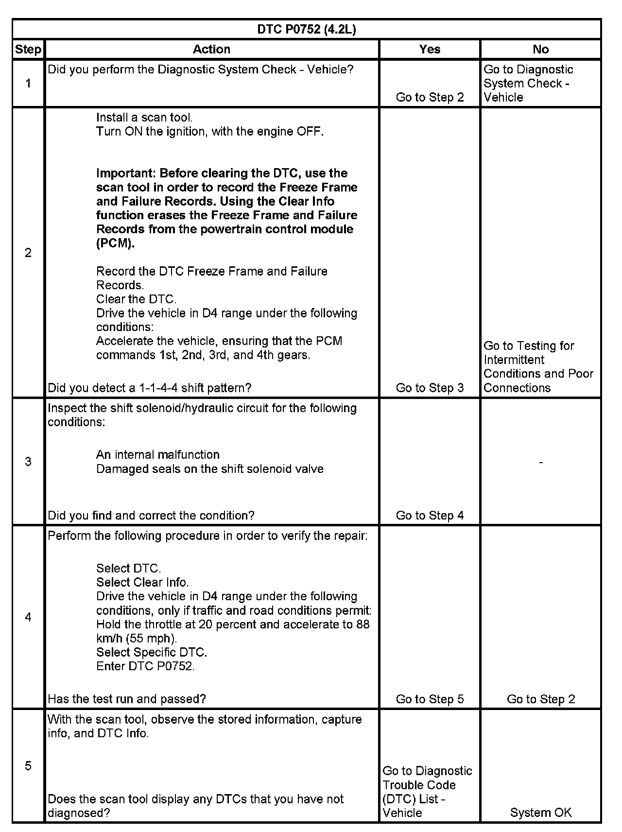 When the powertrain control module (PCM) detects a 1-1-4-4 shift pattern, then DTC P0752 sets. DTC P0752 is a type B DTC.