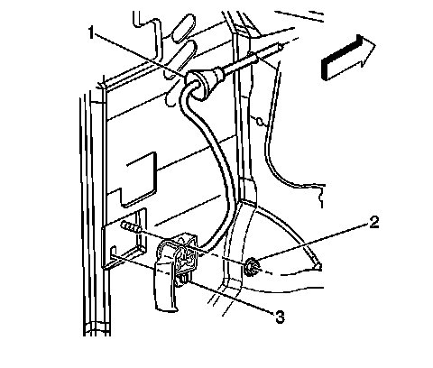 10. Remove the nut (2) attaching the hood release handle (3) to the cowl trim panel on the left side.