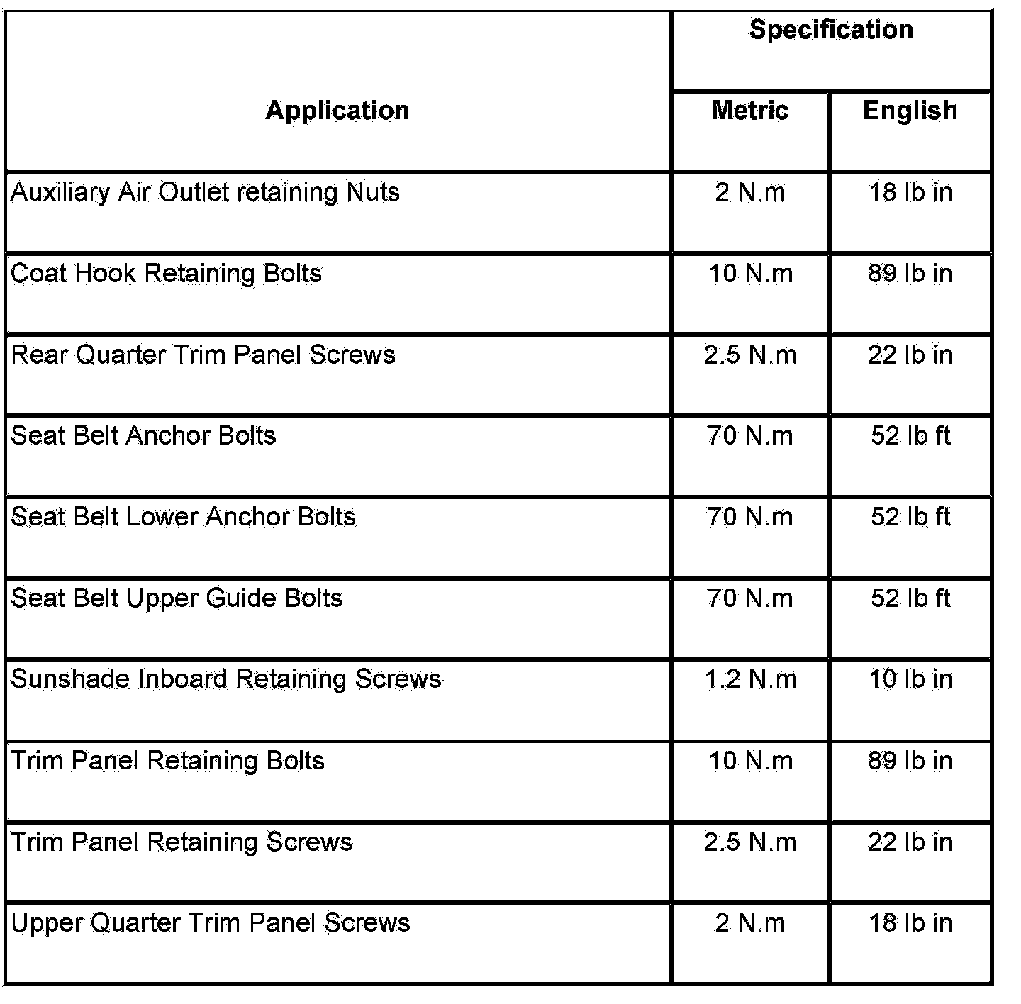 Interior Trim and Paneling - Fastener Tightening Specifications