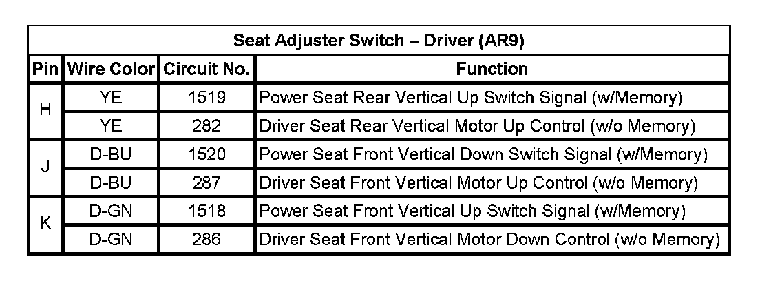 Seat Adjuster Switch - Driver (With RPO Code AR9):
