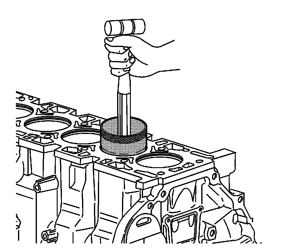 11. Hold the EN-47701 firmly against the engine block. Using a wooden hammer handle, lightly tap the top of the piston until all of the piston rings enter the cylinder bore.
