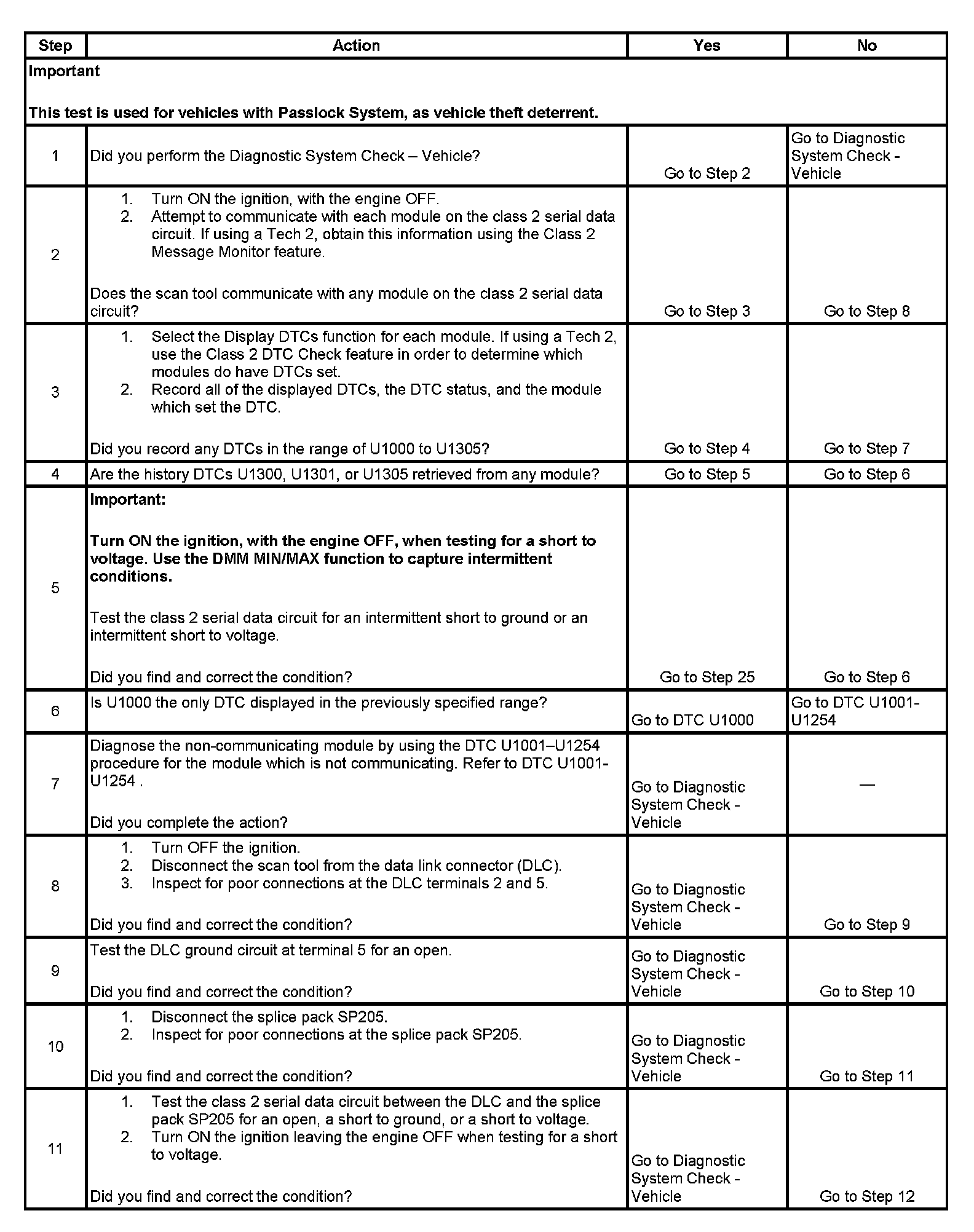 11. An open in the class 2 serial data circuit between the DLC and splice pack SP205 will prevent the scan tool from communicating with any module. This condition will not set a DTC.