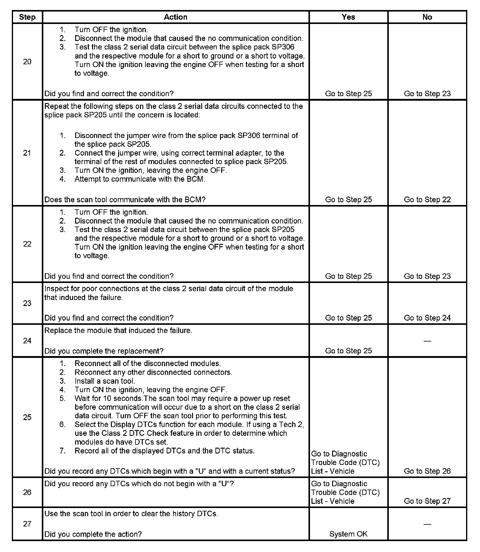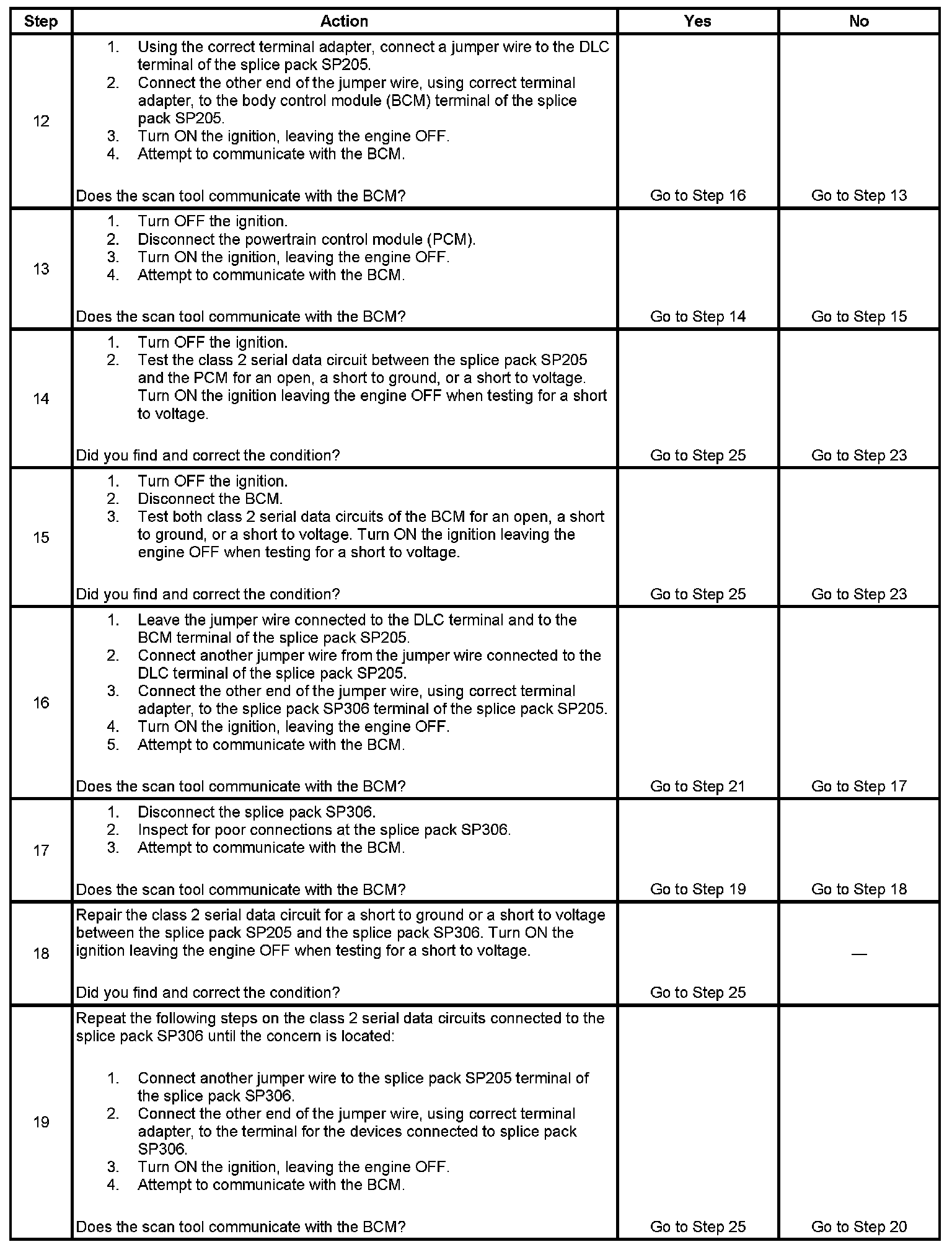 12. The class 2 serial data circuit is shorted to voltage or ground. The condition may be due to the wiring or due to a malfunction in one of the modules. When testing the wire for a short, make sure there is not a module connected to the wire being tested. This test isolates the BCM and the PCM class 2 serial data circuits.