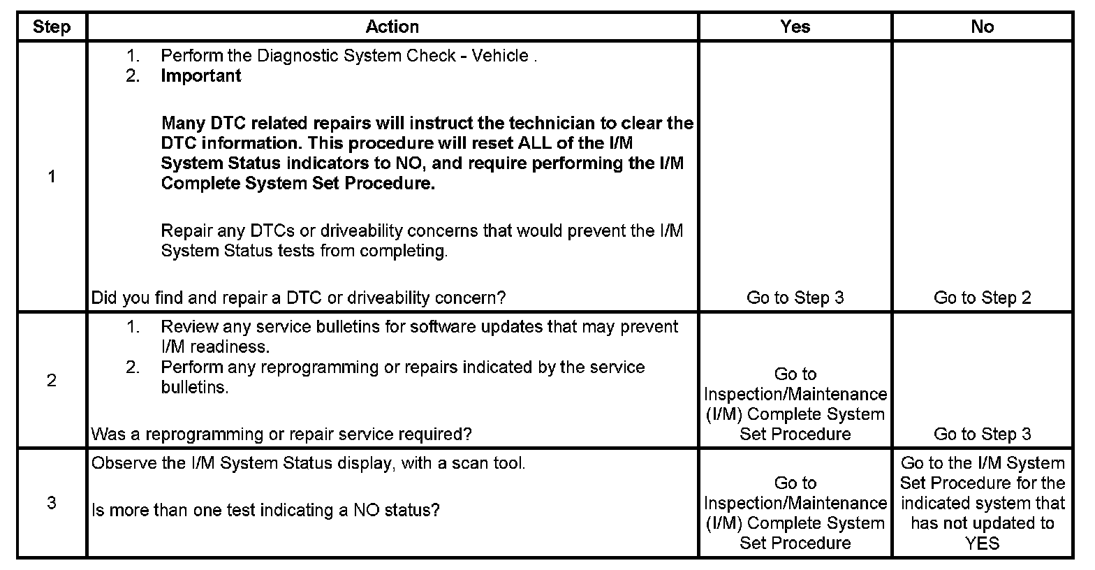 For the specific DTCs required for each system, refer to Inspection/Maintenance (I/M) System DTC Table. Systems such as fuel delivery, misfire, and comprehensive components may not be listed in a system status list. These tests run continuously on some vehicles and may not require an indicator. Inspection/Maintenance (I/M) System DTC Table