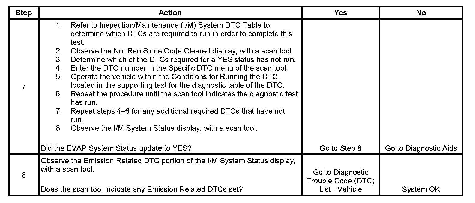 The I/M System Status does not indicate whether the test has passed or failed, only that a decision was made. When all of the diagnostics for a specific system have run and passed, the I/M System Status will update to YES. If a test for a specific system has failed, the I/M System Status will update to YES, indicating a determination was made, even if all of the required tests have not run. When a failure occurs, the Emission Related DTC portion of the I/M System Status display will indicate the malfunction indicator lamp (MIL) is requested. The I/M System Status also registers the number of diagnostic trouble codes (DTCs).