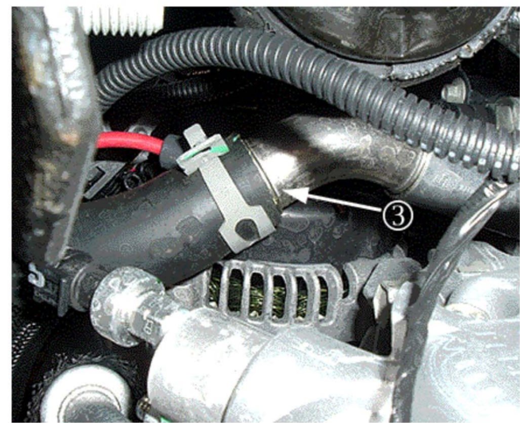 3. Radiator outlet hose (lower hose) to engine (3). (Shown as viewed from below.)